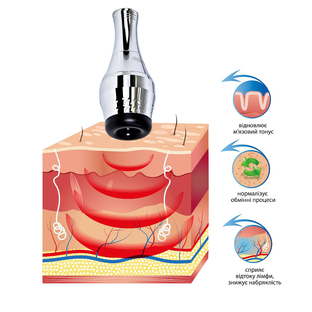 Contracțiile vacuum de înaltă frecvență asupra pliurilor de piele provoacă o stimulare intensă a țesuturilor. Conform legii hidrodinamicii, conținutul capilarelor, vaselor limfatice și substratul intercelular se deplasează alternativ în zona de presiune redusă și înapoi. Frecvența ridicată a contracțiilor face ca procedura să fie complet nedureroasă pentru pacient.
